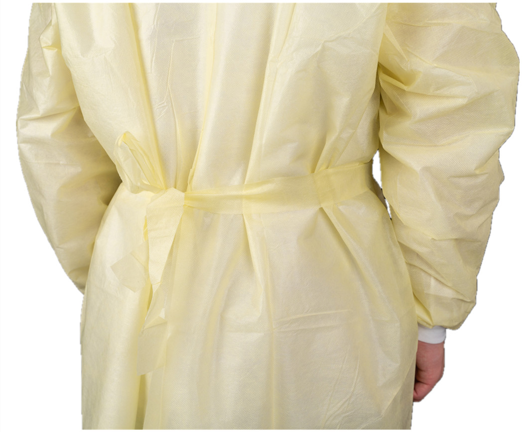 Nivel 2 No irritante, desechable, resistente a líquidos, uso médico, vestido aislante con muñeca de punto.
